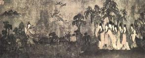 紧随其后的六朝,一个蓬勃的绘画艺术朝代又出现了。“自生人以来未有也”的顾恺之,工诗赋,擅冉法,他笔下的《女史箴图》“气韵生动”,境界超然。一幅《洛神图》虽然描述了一段曹植与洛神之间的凄婉的爱情故事,却不也蕴涵着人、神之间有着一种默契与沟通吗?六朝的绘画技法的头一条“气韵生动”道出画家应以修身养性为主,才能使笔下的人物、山水、鸟兽,花草生机勃勃,意境深远。“画如其人”的说法大概就是从那个时候来的吧。我们再看这六朝的哪一个画家不是深受道、儒学说的熏陶,并对佛教景仰甚至崇信的呢?精湛的六朝丹青绘画艺术被其后的隋代画家所承传。阁楼宫观、人物肖像和神话故事的巧妙结合散发着宁静而安详的精神气息。展子虔的《游春图》画面蕴涵着愉乐,悠然的气息,远处的山景、花草、树木与近处的人物还有着互相衬托,互相默契的奇妙之处。