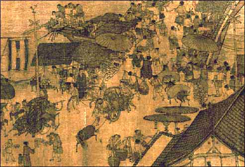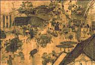唐代渐渐隐去后,随之而来的宋朝画家在人物,山水,花鸟画上都有着新鲜的创意。《清明上河图》画风细致,淳朴,活泼传神的人物性格描绘起到了画龙点睛的效果。此图从右至左,由郊外到市区,细致生动地描绘了当时北宋都城汴梁(今河南开封)清明时节繁荣的景象。全图共分三段。首段着墨于郊原景色。郊外远处的山,树,船只与近处的草木,庄稼,村舍,人物勾勒出由远到近的层次,默默地有着一种“山水总相宜”的情趣。中段着墨于虹桥之景。桥头摊商栉比,车马行人川流不息,生气盎然。末段着墨于城内街景,歌楼酒肆,作坊医家,各色人物各行其事,极具欣赏价值。此幅画的绝妙之处除了对舟车,市桥,郭径,草木,山石,牲畜的细微刻画之外,对人物形态的捕捉与对其所处位置的巧妙合理严谨地安排是此幅作品的精华所在。各色人物共1643人,形态生动,他们或是站立于郊外田野,或是辛勤耕作在田间,或是敲锣打鼓办喜事,或是聚集闹市买卖游玩,或是轻舟荡漾于河中,或是垂钓捕鱼,或是走亲访友,或是问候交谈,等等等等。整幅图着色淡雅,主要以青黄为主,壮观的场面,细腻精确的画风令人叹为观止。此幅巨型风俗画,虽意境并不深远,但极具历史文献价值。由于当时的社会经济繁荣,开始表现世俗生活的风俗画更加受人青睐,这与以往的重视精神境界的艺术品位有所差异。