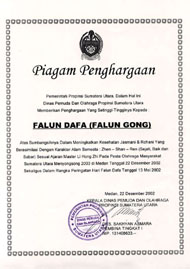 至高评价,鉴于它在2002年12月22日举办的苏门答腊民众迎接2003年的运动会,通过按照李洪志师父所教导的同化宇宙特性“真善忍”来提高身体和精神素质所作出的贡献,同时作为纪念2002年5月13日的法轮大法日。