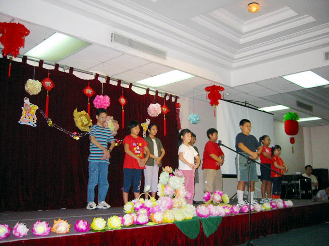 【明慧网2003年2月9日】二月八日星期六,在风景优美的东海岸公园,一百多名新加坡法轮大法弟子会聚一堂,交流修炼心得并且共同学习。晚上,学员们邀请了多位不修炼的亲朋好友,共进晚餐,并利用这个机会弘扬大法,讲清真相,欢度佳节。为了这次活动,大法弟子们进行了精心的准备。会议厅里挂满了红灯笼等节日饰物,舞台上摆放着学员自制的精美的莲花。学员们各显身手,表演了丰富多彩的节目:有的弹琴,有的唱歌,一组小弟子上台炼功,并演出了感人的短剧“美好家庭被拆散”,呼吁停止对法轮功的。电视小组播放了几部洪法和的短片。