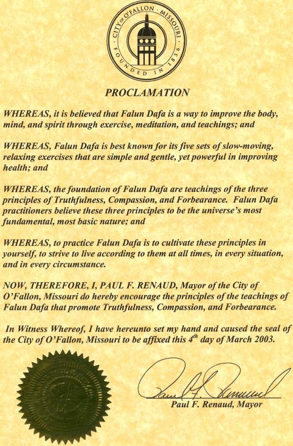 美国新墨西哥州波斯克镇颁布褒奖令,宣布2003年2月为“法轮大法月”。