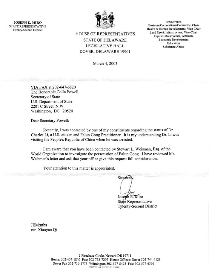 我知道“追查迫害法轮功国际组织”的律师斯图尔特.魏思曼(Stewart L. Weisman)先生跟您联系过。我已经阅读了魏思曼先生的信,并请求您的办公室能对此请求给予全面认真的考虑。
