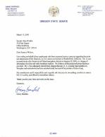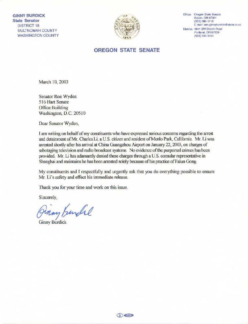 我代表我的选民们在此给您写信,他们表达了对加州门罗帕克市居民,美国公民查尔斯·李被捕及监禁深切关注。李先生于2003年1月22日刚抵达中国广州机场就被捕,被指控破坏电视和广播播放系统。但对这些所谓的罪名[中国政府]没有提供任何证据。李先生通过一名美国驻上海领事馆官员坚决否定了这些指控,称他被捕完全是因为他修炼法轮功。