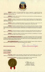 鉴于,密苏里州参议员们始终乐于表彰那些参与者,为周围社区和邻里带来极大益处的本州的一些团体;而且鉴于,法轮大法,亦称法轮功,作为一种深深根植于古老中国传统文化的自我改善修炼方法而卓而不群;而且鉴于,法轮大法有五套动作缓慢柔和的动功和静功功法,对寻求在减缓压力和身心全面健康方面取得显著积极效果的学员们强调能改变人生的原理真、善、忍;而且鉴于,尽管在其发源地中国遭到残酷迫害,法轮大法在过去的10年里已经传遍全世界60多个国家,拥有一亿学员,其中包括本州居民;而且鉴于,法轮大法于1995年传入密苏里州,从此在全州诸如图书馆和书店等地方举办了几十次免费介绍学习班,主要报纸和电视媒体对该非政治性团体进行过报导和采访,[学员们]捐出书籍及炼功录像带供公众使用;而且鉴于,在2003年2月23日到3月1日法轮大法周期间,欧沃兰(Overland)市居民和大圣.路易斯地区,全密苏里州及其支持者一起庆祝法轮大法;而且鉴于,密苏里州参议员们表彰致力于美国及其他国家的基本人权和自由的当地团体的成就是合乎情理的;鉴此,我们,密苏里州参议员们与第92届众议院联合一致褒奖自我完善及非暴力的法轮功功法,并向其学员表示我们最衷心的祝福,他们不断地告诉我们要启悟人们珍惜生命并积极地修炼自己;并且进一步决定,州务卿要准备一份书写得体的本决议副件,以在全密苏里州表彰法轮大法。