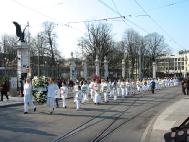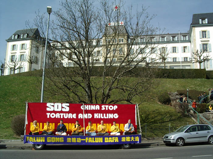 【明慧网二零零三年三月十八日】第59届联合国人权大会3月17日在日内瓦开幕。为了引起联合国对中国政府[江氏集团]残酷镇压法轮功的关注,世界各地法轮功学员一如既往,在人权会议召开的第一天,齐聚瑞士日内瓦,向世界各界人士发出呼吁,希望共同制止中国政府对无辜的法轮功学员的迫害。来自四十多个国家的上千名法轮功学员17日在日内瓦举行了游行请愿,游行队伍声势浩大、肃穆壮观。
