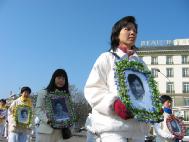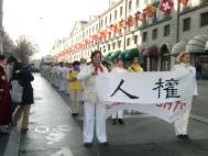 游行队伍由手持写有“人权”二字横幅的两位身着白色服装的女学员开路。紧跟在后的是身穿白色服装、手持被迫害致死的法轮功学员照片数十位学员。