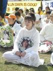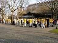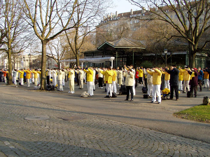 新闻发布会结束后法轮功学员象往年一样开始了一天的以炼功的方式进行的和平抗议。