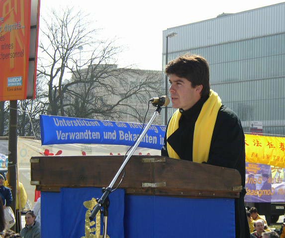 随后,一千多名法轮功学员在万国广场举行了新闻发布会。主持人、瑞士法轮大法协会副主席让-皮埃尔.马尔维在开幕词中说:“我们热烈欢迎你们这些来自世界四面八方的人们,你们来到这里呼吁停止在中国对法轮功的迫害。这场迫害已经使成千上万人的人们成为受害者,并使千百万家庭遭受痛苦。”