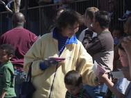 彩车上放着两个莲花台,彩车的尾部挂着用英文写着“真,善,忍”和“法轮大法好”的横幅。一路上,两名东方学员和两名西方学员分别在彩车上作了功法表演。两位东西方女学员分别在莲花台上盘腿打坐,十分优美。有不少游人,包括儿童,认真地模仿着学员的功法动作,有的人竖起大拇指,还有的人挥手致意。