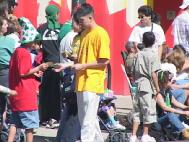 游行当天,天气格外的晴朗。一大早,学员们从四面八方来到了游行准备场地,有的给气球充气,有的装饰彩车,有的折叠小传单,有的在给过路人发资料和作简单的功法讲解。