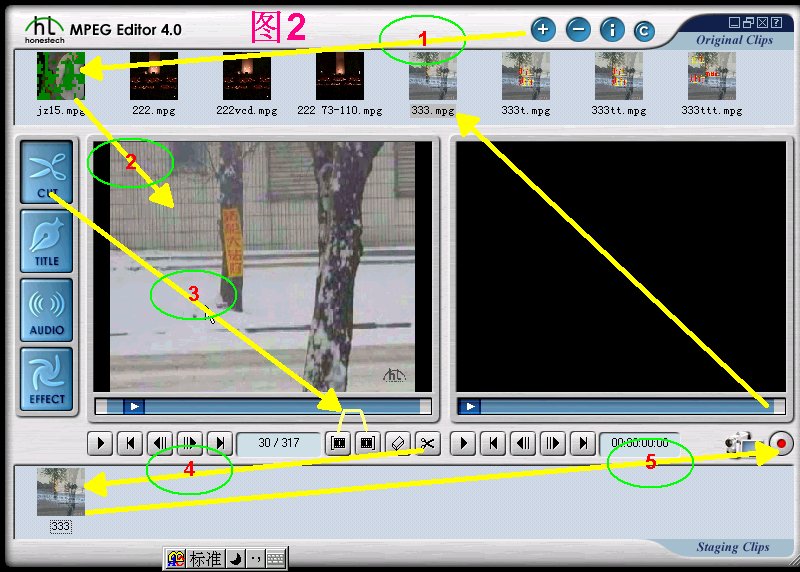 图2 步骤说明:1.打开文件---2.把文件拖入’影片处理窗口’(左窗口)---3.进入‘剪切’状态(按下‘剪切’按钮,默认是剪切状态) ,选定剪切区域(时间段)---4.剪切---5.输出-333.mpg。这一文件将自动加载到honestech MPEG Editor的顶部(源影片区)