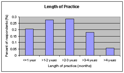 A.5. 修炼时间(截止期1999年12月)。在229例反馈中,平均修炼时间为26.4个月(标准误差值14.2,时间范围1-64个月)