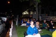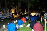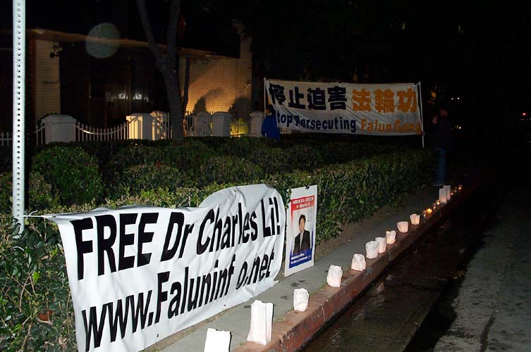 【明慧网2003年3月21日】洛杉矶大法学员从星期二至星期四在中领馆前举行烛光守夜,强烈抗议与谴责江氏集团3月21日对李祥春同修蛮横无理的虚假审判。