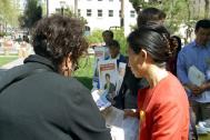 新闻发布会当日,加州首府沙加缅度晴空万里、阳光明媚,经过州政府大楼的官员、工作人员及游客络绎不绝,还有一批批的学生在老师的带领下参观首府。学员们充分利用这个机会向他们讲真相,征集签名;许多人听了李祥春被捕的经历,觉得非常气愤,认为不可思议,并主动询问他们能做些什么。