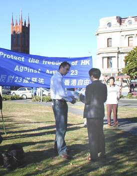 【明慧网2003年3月25日】3月17日至18日,新西兰大法弟子们以及其他各界社会人士共同为反对香港基本法第23条发起了从奥克兰至首都惠灵顿的汽车游行。沿途受到了媒体的关注,在惠灵顿国会大厦前,国会议员、外交关系副主席格兰汉姆-凯利(Graham Kelly)等发言,对这次游行表示了支持。进步联盟党议员Robinson说:“议会的大门永远向你们敞开着,你们可以在这里表达你们的观点而不用担心被警察逮捕……”萨德-辛普森(Ced Simpson)代表大赦国际进行了发言,他谈到在中国大陆以颠覆罪为由对异见人士的迫害是很多的,这包括对中国民主运动,法轮功等团体的迫害;他不希望这种现象在香港出现。