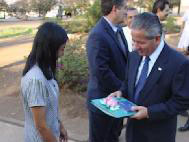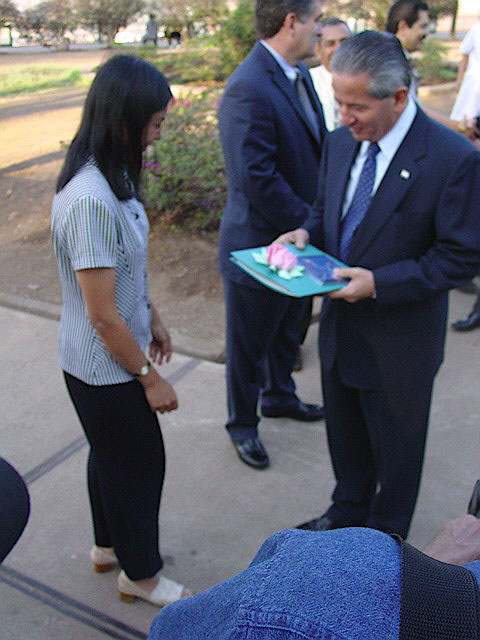学员亲自向洪都拉斯总统赠送真相资料和一朵莲花,总统先生热情地感谢我们把真善忍带到他的国家。向洪都拉斯国会主席介绍真相,他立刻表达了愿意帮助制止[在中国的] 这场迫害的意愿。