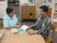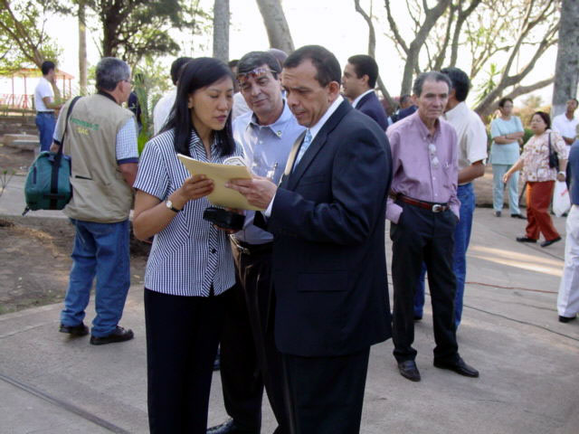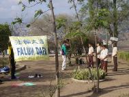 在洪都拉斯首都特古西加尔巴雄狮公园炼功点,许多学生急切地尝试功法。在洪法途中,我们向沿途所有主要图书馆赠送了大法书籍。ICI图书馆管理员正在了解大法。