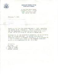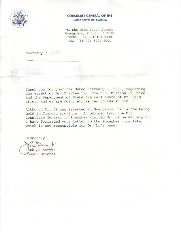 感谢你2003年2月5日就查理斯-李祥春被逮捕一事发来的传真。美国驻中国的外交机构和美国国务院非常了解李祥春被捕一案,我们会尽全力去帮助他。