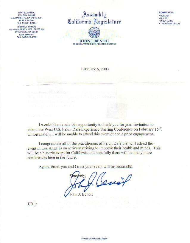 我愿借此机会,感谢你邀请我参加于2003年2月15召开的美西法轮大法修炼心得交流会。可惜我的日程安排已满,无法参加这次活动。