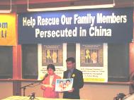 一位华人社团负责人在与“李祥春之友”负责人克里斯蒂娜长时间交谈后,在“营救李祥春”海报前同她合影,并说:“真想不到除李祥春之外还有那么多北美学员的家属受迫害,这场对法轮功的迫害该停止了!”