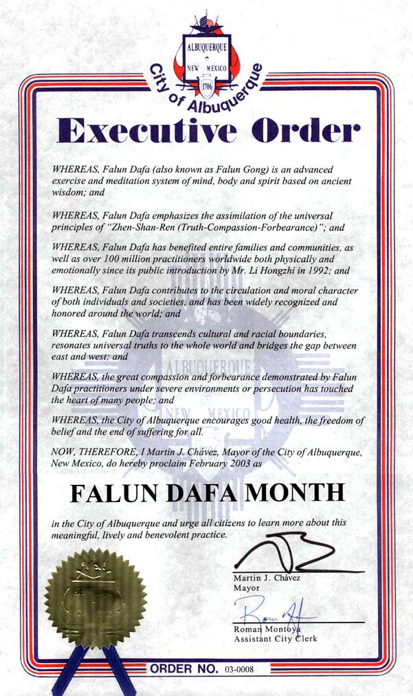 美国新墨西哥州阿尔伯魁市宣布2003年2月为“法轮大法月”