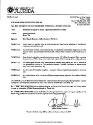 佛罗里达大学全体学生第2003-103号决议我们,佛罗里达大学学生,在此通过决议: 主题: 决议支持在中国的法轮功学员的人权起草人: 苏曼-叙利瓦森(Suman Srinivasan) 詹妮-吴(Jenny Wu)发起人: 盖-克劳蒂 圭里尔,第A区学生评议员鉴于, 法轮功是一项基于真、善、忍的和平打坐功法;并且鉴于, 中国江氏政府在中国禁止修炼法轮功,而且企图系统地铲除该功法及其学员;并且鉴于, 江氏集团在全中国范围内成立了臭名昭著的‘610’政府办公室,通过办洗脑班、酷刑折磨和谋杀,监督迫害法轮功学员;并且鉴于, 目前,法轮功学员在中国的人权被剥夺,违反了《国际公民权利与政治权利公约》、《世界人权宣言》,以及中国自己的宪法;并且鉴于, 佛罗里达大学长久以来一直是为全世界人民的人权而努力的表率;并且鉴于, 佛罗里达大学学生评议会一贯尊重人权和信仰自由;因此,学生评议会通过决议,谴责中国[江氏]集团三年半来对法轮功迫害中的违反人权行为;并且决定,佛罗里达大学学生评议会呼吁中国当局在中国停止迫害法轮功;并且决定,学生评议会呼吁中国当局与法轮功展开对话,恢复法轮功学员的人权。