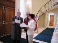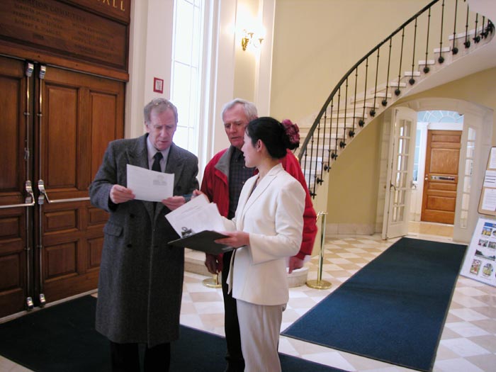 虽然时逢罕见的暴风雪,许多机关都关闭了,我们的活动得以在市政厅举行。市长和市政府工作人员都认真倾听了法轮功的真相,了解了李祥春遭受的