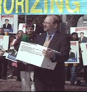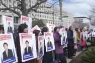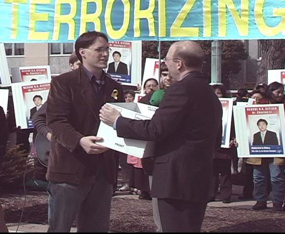 在大约下午1:30左右,两名国务院代表,国务院副助理国务卿Scott Carpenter先生和人权民主办公室亚洲问题高级顾问Susan O’Sullivan女士来到了集会的法轮功学员中间,符泳青和李祥春的朋友们将一封呼吁信和两万多个签名交给了Carpenter先生。