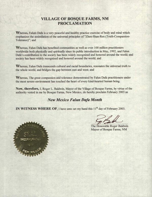 因此,我,罗杰.鲍德温,波斯克镇市长,以新墨西哥州波斯克镇授予我的高贵权力,在此宣布2003年2月为