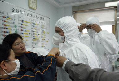 ![]() 4月17日一名西方记者“全副武装”准备进入北京地坛医院SARS隔离病房采访(法新社) |