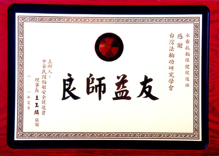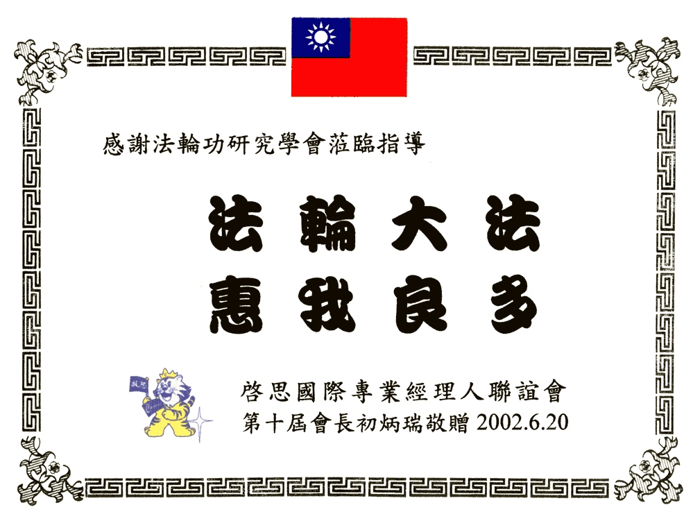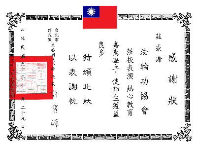 2002年12月18日,台北市癌症救援促进协会感谢状2002年12月8日,台北市新和国小感谢状2002年10月20日,2001宜兰国际童玩节感谢状2002年夏,中华民国辐射安全促进会感谢状2002年6月20日,启思国际专业经理人联谊会感谢状2001年12月29日,台北市永春国小感谢状