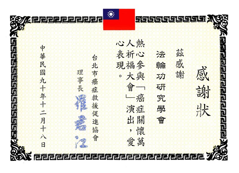 2002年12月18日,台北市癌症救援促进协会感谢状