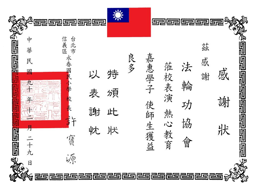 2001年12月29日,台北市永春国小感谢状