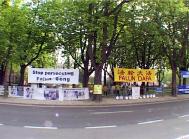 上午12时学员们在使馆门前举行了新闻发布会,欧盟议员和比利时国会议员都发来了他们的支持信。旅居荷兰的法轮功学员王湘鹤讲述了她的家人因为坚持真善忍的信仰被江泽民集团迫害的亲身经历。