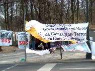 当日气候恶劣,狂风大作,学员们不为所动,坚持展示祥和的音乐和五套功法。展示的横幅无数次被狂风刮走,甚至撕裂,学员们无数次地粘补、修复,再挂上。狂风中,学员们频频发正念,每次发完正念后风就停了。中西学员们不断地向路人讲述江氏疯狂迫害善良的法轮功修炼者的事实真相,发动愿意签字的德国民众接力在熟人中征签,之后马上邮给议会主席、外长及联邦总统。柏林有很多俄国游人,俄裔大法弟子就用家乡话讲真相。