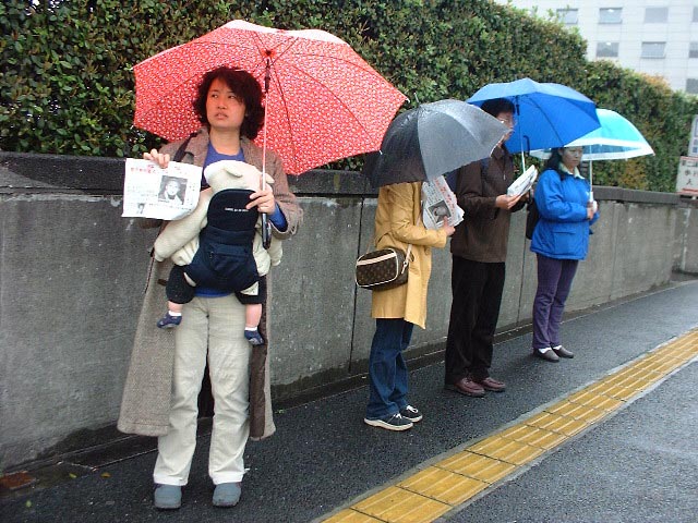 期间,刚好有中国地方政府访日代表团的大客车停在请愿队伍处,前往国会参观访问,法轮功弟子不失时机地向他们分发真相资料,同时通过同司机交谈,将中文的真相资料和VCD放在车上,可由大家方便取阅。代表团有的成员直接鼓励大家干得好。