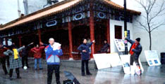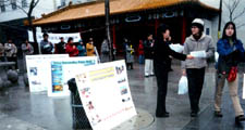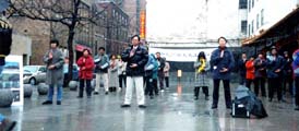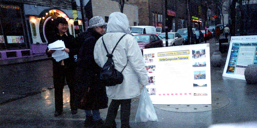 【明慧网2003年4月30日】4月26日下午5点,蒙特利尔大法弟子在唐人街中心的中山公园集会,隆重纪念1999年4月25日震惊中外的万人上访国务院的伟大壮举。中山公园内高高地悬挂着“纪念4.25万人大上访四周年”的横幅,沿公园的人行道边摆放着各种真相展板。从早上开始一直未停的春雨,在活动开始前基本停止下来,本来行色匆匆的行人也停下脚步;在优美的集体炼功场旁,伴随着悠扬的大法音乐,有的留影纪念,有的阅读展板,有的观看功法,有的甚至现场学功,使得饱受SARS影响的唐人街面目一新。过往的中外人士今天都非常友善,很少有人拒绝接受学员们递出的真相材料。