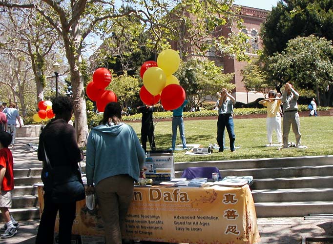 行人们被优美的功法吸引,驻足学功的人络绎不绝,特别是年幼的孩子们,更是纷纷取走免费书签和真相光盘,并当场学功。