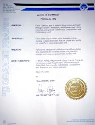 褒奖令鉴于,法轮大法是一项和平与健康的身心修炼,强调同化宇宙特性真、善、忍;并且鉴于,全世界有上亿的修炼者,法轮大法对社会的贡献,在世界各地得到广泛肯定和嘉奖;并且鉴于,法轮大法超越文化和种族的界线,对所有的人都展现出了大善大忍的胸怀;并且鉴此,我,伍德布法罗自治区区长道格拉斯 L 弗奥克勒,在此郑重宣布2003年5月13日为:“法轮大法日”我于2003年4月17日在本证书上签字并加盖阿伯他省福特迈克马瑞市伍德布法罗自治区印章,以此为证。