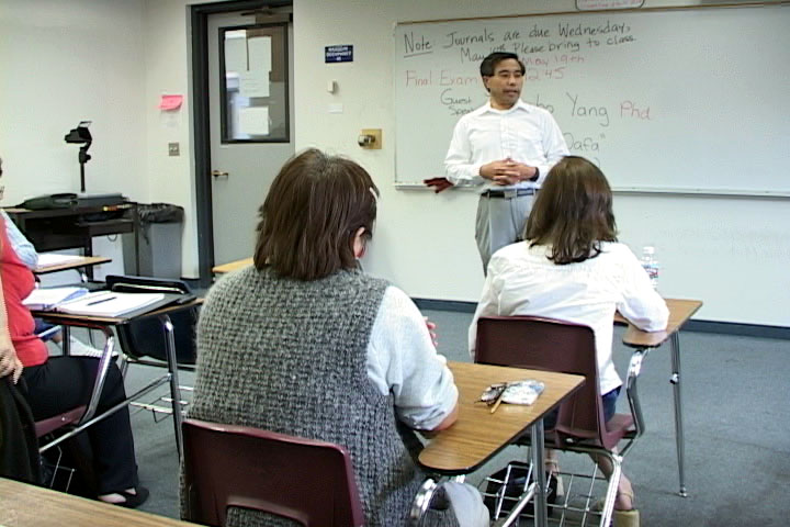 【明慧网2003年5月11日】二零零三年五月五日,应尔湾大学(Irvine Valley College)讲师Yolanda Gouldsimith的邀请,橙县的法轮功学员欣然走进了大学的课堂,向学生们介绍法轮大法。