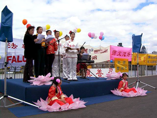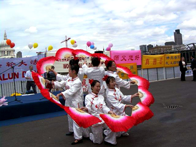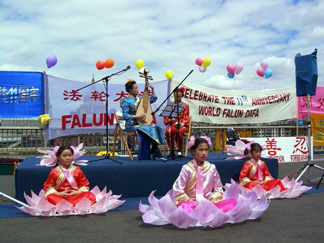 五月十一日,伦敦泰德艺术馆门前一片喜气洋洋的景象,英国大法弟子在此举行了一系列文娱演出,欢庆法轮大法洪传十一周年暨“世界法轮大法日”四周年。