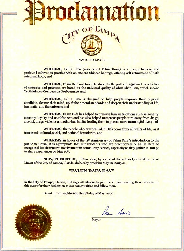 鉴于,为庆祝法轮大法洪传十一周年,特别是当我市修炼法轮大法的居民将于5月10日在坦帕市集会分享修炼体会之时,现在是对他们积极参与社区服务活动予以嘉奖的恰当时机。