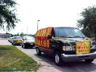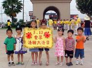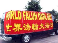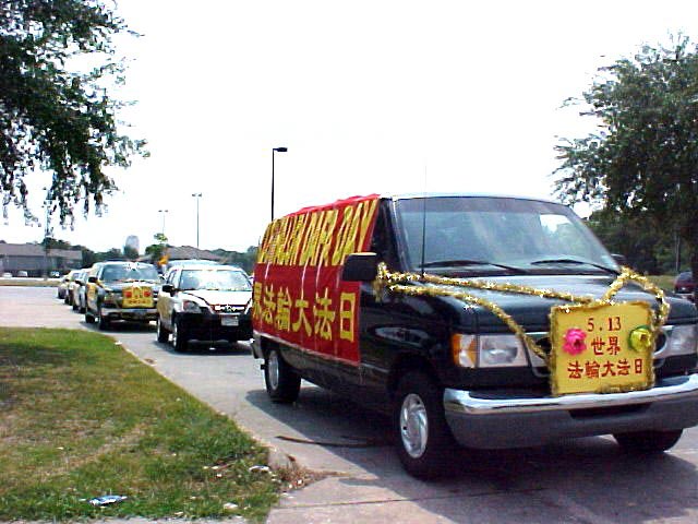 五月十日这一天的庆祝活动是汽车游行。上午十一点至下午一点,弟子们开着饰有“法轮大法---真、善、忍”、“法轮大法好”等横幅的汽车,行驶在中国城中,引起了市民极大关注。