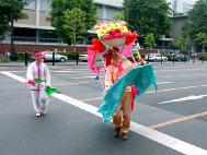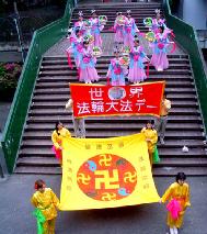 大法弟子的队伍浩浩荡荡,领头一群身着古装的仙女,她们手持花篮、彩带,满面春风,翩然起舞。随后是鲜艳花朵盛装的大型彩车,车头上的“真善忍”金黄大字分外醒目。车上身着金黄色炼功服的弟子们,伴随着音乐演示着法轮功5套功法。4位女弟子手持一面法轮图形随后,世界法轮大法日的横幅跟随,其后是一人划桨,引领一只旱船,荡漾前行,4位弟子少女打扮,肩挑花篮而来,再后便是欢快活泼且颇具中国东北地方特色的“大秧歌”方阵。身穿鲜艳唐装的大法弟子们,在锣鼓喧天的秧歌曲中起舞,最后是举着各式庆祝横幅的男女老幼弟子,个个脸上流光溢采,游行队伍一路走来,让人目不暇接,美不胜收。