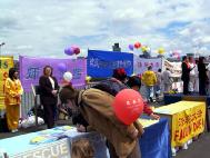 位于泰晤士河边的泰德艺术馆,今天显得格外美丽,远远就看见五色彩球高高托起“法轮大法好”的垂帘,八副精致锦缎上的法轮图形在风中轻轻摇摆,向来往行人述说着真善忍的真谛,络绎不绝的人群纷纷驻足观看。沿河的扶手上挂满了庄严肃穆的中英文横幅,蓝色地毯搭起的舞台,舞台旁的展桌上是各类大法资料和义务书法展台,在大路旁还有营救亲人的大型展板和图片。