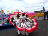 五月十一日,伦敦泰德艺术馆门前一片喜气洋洋的景象,英国大法弟子在此举行了一系列文娱演出,欢庆法轮大法洪传十一周年暨“世界法轮大法日”四周年。