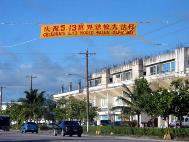 今年5月13日“世界法轮大法日”,塞班的大法弟子自己制作了两幅20尺长,3尺宽的中英文横幅,在政府相关部门的帮助下,将横幅分别挂在了塞班岛最主要的交通地段,黄底红字的横幅横跨在马路的上空,醒目而耀眼。