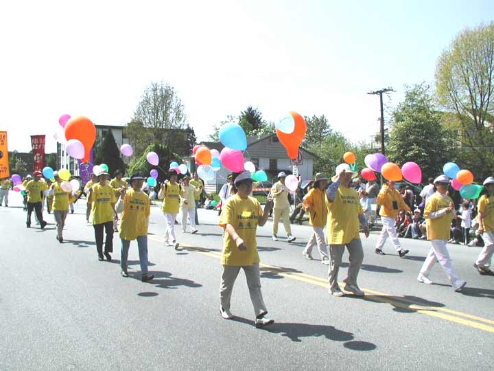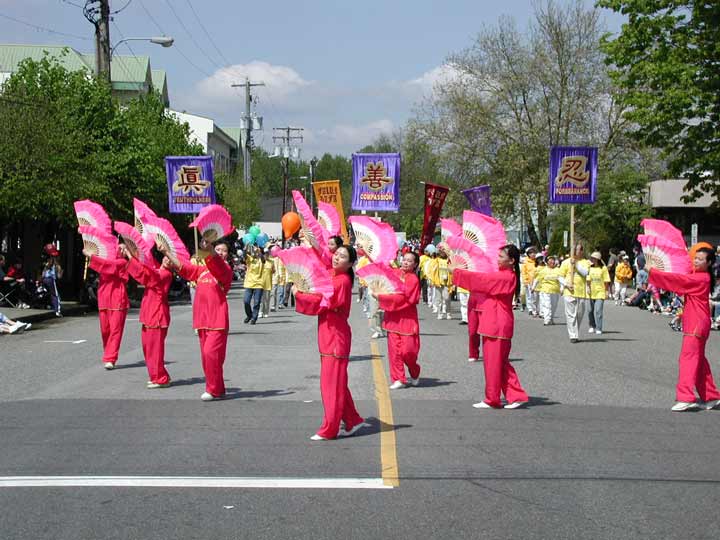 【明慧网2003年5月14日】5月10日,位于温哥华市东郊的高贵林港市举行了庆祝建市90周年,及五月节社区节庆80周年的大游行(May Day Grand Parade)。温哥华的法轮功学员不放过这一向世人洪法的好机会,参加了游行,向世人展示法轮大法的美好,经过之处,路边观看的人群不断向法轮功学员发出欢呼声和掌声。这是温哥华法轮功学员连续三年参加这个城市的游行。
