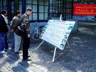 在广场上,学员们放置横幅,摆好传单。一些学员演示五套功法,一些学员向过往行人发传单,讲真象。很多行人对这优美的功法很感兴趣,驻足观看。数名媒体的记者前来采访,认真了解法轮大法,并关心中国学员在中国的真实情况,还摄下我们活动的场面。