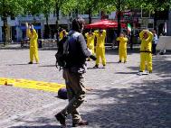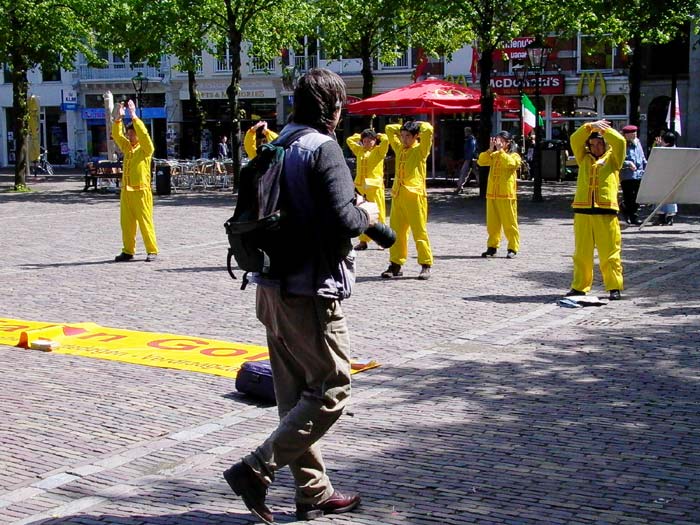 海牙是荷兰的政治中心,是著名的国际法庭所在地;国家的议会大楼就位于广场的旁边。今天议员们正在议会里讨论;但是突然发生的火警信号使所有的议员及大楼的工作人员离开大楼来到广场,有幸观看了我们的大法日活动。